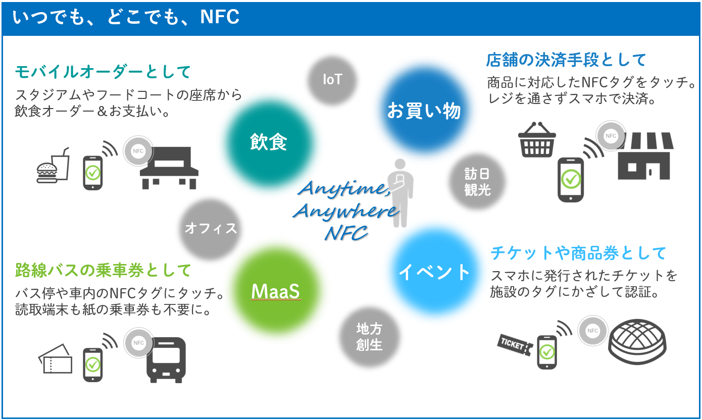 NFCのリーダー/ライターモードを活用した、決済・チケット認証・情報配信など、さまざまなサービスの認証を非接触で実現できるプラットフォームです。事業者の提供するアプリやWebページと連携することで、NFCタグを読み取る際に正しいNFCタグにかざされているか認証を行い、タグIDごとに遷移先のコンテンツをコントロールすることが可能になります。