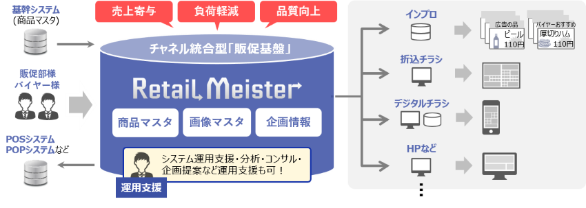 「Retail Meister」は、全チャネルの販促情報を一元管理する「チャネル統合型販促基盤」です。