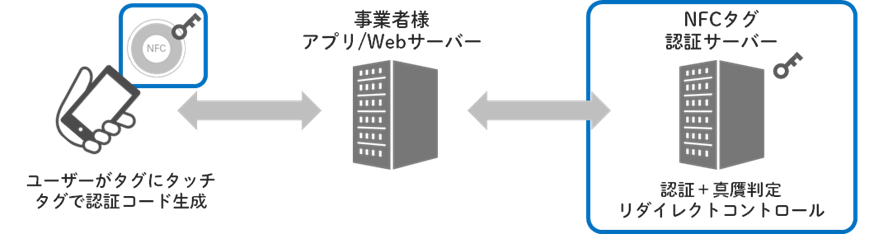 NFCタグと認証サーバー間で認証コードの正当性やカウンター同期により、NFCタグの偽造を防止し、サービスを受けるべき場所でかざされているか判定することができます。