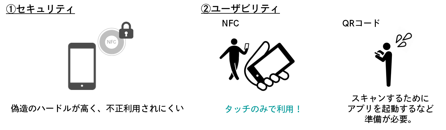 NFCは、QRコードに比べてセキュリティ性が高く、操作性に優れています。