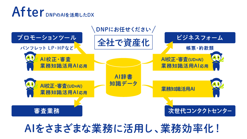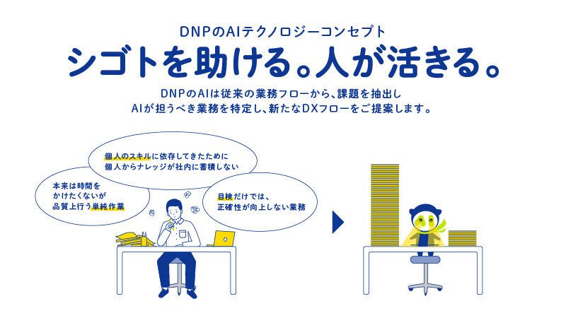 DNPは従来の業務フローから、課題を抽出し、AIが担うべき業務を特定し、新たなDXフローを提案します。