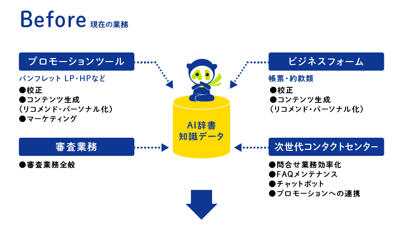 「AI校正・審査」では、複数部門、担当者が多大な労力とコストをかけて実施している 製品パッケージやポスター・チラシ・パンフレット・Webなどの校正・校閲・回覧の審査業務を 画像認識AIと言語処理AIの2つのAI技術を活用し支援します。 「業務知識活用AI」では企業が持つ業務文書を自然言語処理AIを用いて知識グラフ化し、活用することで保険会社の加入申込審査や広告の校正・校閲、社内ナレッジの横断的な検索・分析などを支援します。
