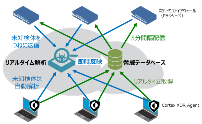 脅威インテリジェンスクラウド「WildFire(ワイルドファイア)」との連携により、世界中の脅威情報をリアルタイムに取得・分析、結果データを共有することで、新たな脅威や攻撃手法にも対応します。