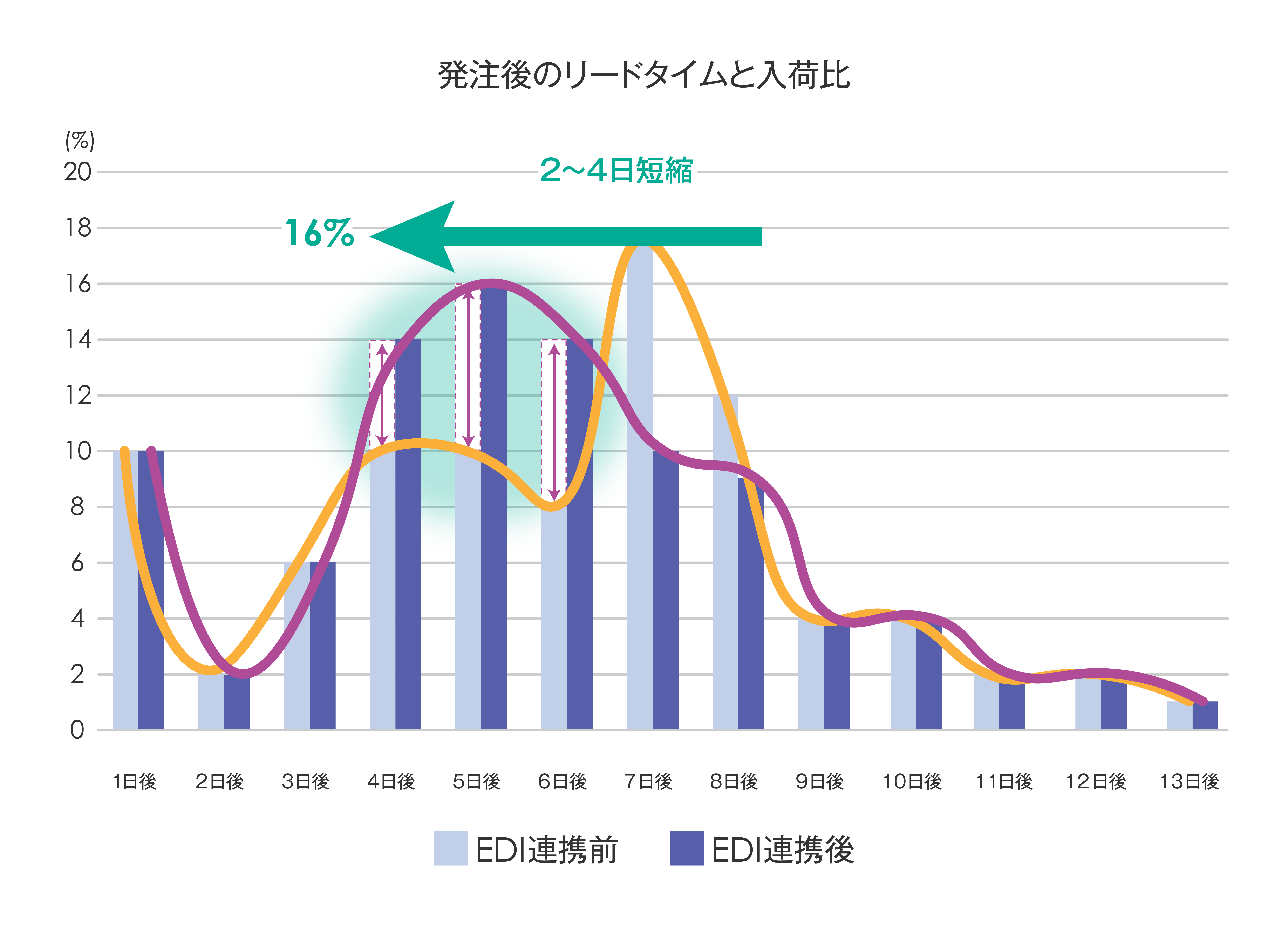 倉庫EDI連携が稼働している出版社の連携前後の2週間の推移を抜き出し、総発注数に対する入荷数の比率を、入荷リードタイムごとに比較。