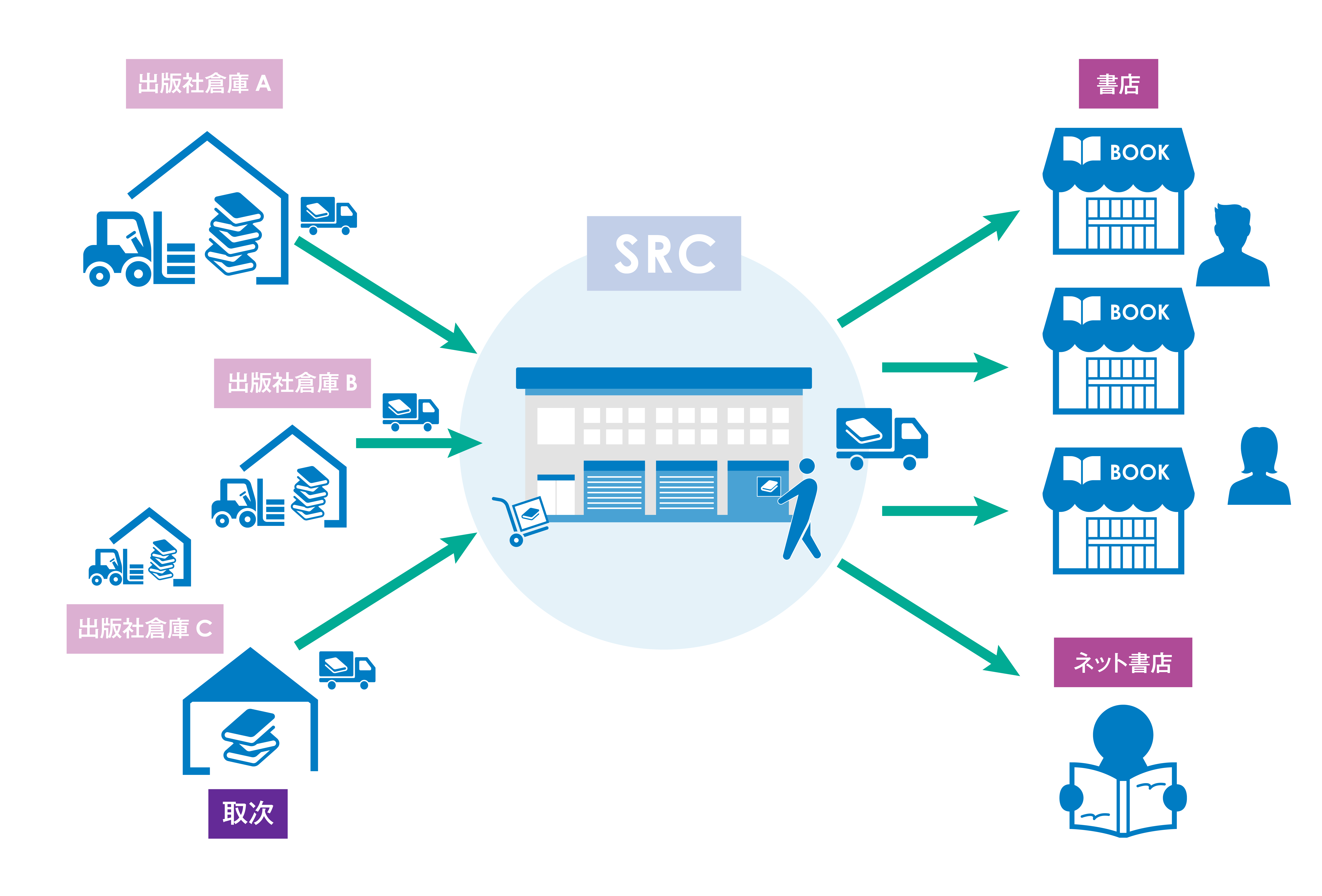 ※2 SRC:「書籍流通センター」の略称。SRCは、店舗間の在庫の偏在をなくし、翌日出荷により、販売機会損失ロスを防ぎ、返品削減を目的とした店舗補充機能と、通販機能を持った書籍流通センター