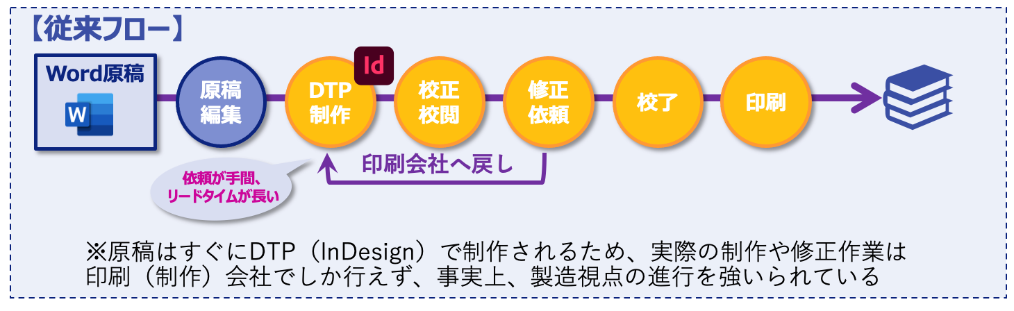 これまでの一般的な編集・制作フローは、上記のような流れではないでしょうか。Wordなどで執筆された原稿をDTPでレイアウトに流し込み、「紙」や「PDFを出力」して確認。ここには、原稿を別データに変換(DTP上で組版処理)するという「待ち時間」が存在してきました。