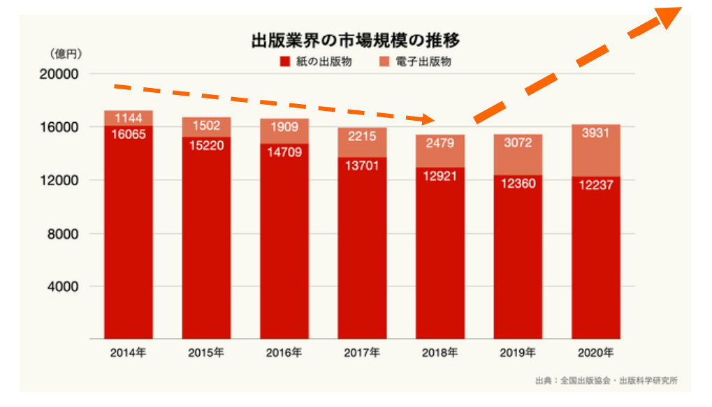 2018年からすこしずつ回復傾向にあり、紙の出版市場の落ち込みを電子出版市場の拡大が上回っています。電子出版市場だけを見れば前年比28.8%増の3,931億円と、大幅に増加しており、内訳は、電子コミックが3,420億円、電子書籍が401億円、電子雑誌が110億円となっています。
