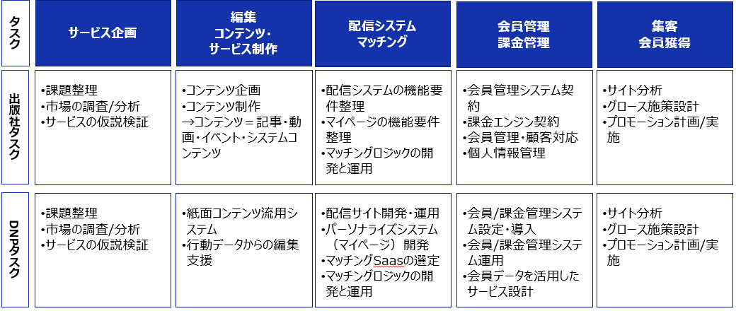 DNPの考える雑誌DXは、従来のようなウェブ制作や印刷物製造といった受託モデルはもちろん、提供サービス、メニューを出版社様と共同で開発し、「協業事業」としての開発・運営もご提案します。