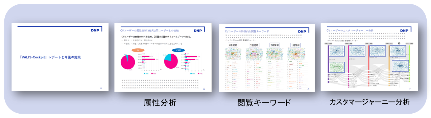 また、VALIS Cockpitの分析とともにレポート提出を行ない、次月以降の配信見直しや分析結果に基づく施策をご提案いたします。
