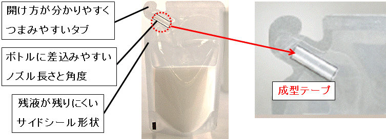 ノズル内部に成型テープ(UNテープ)を取り付け、内容液の排出性を向上