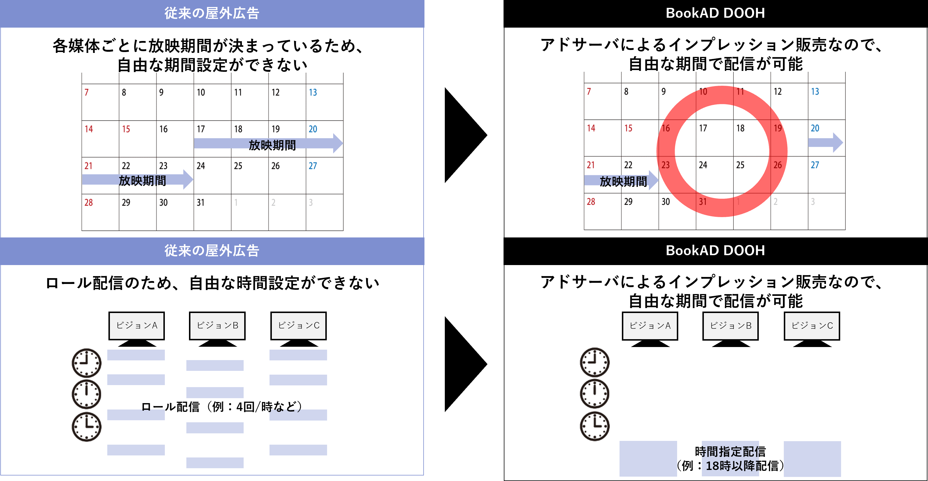 それに対してDNP BookAD DOOHは、屋外サイネージ広告のアドネットワーク化による一元管理が実現したことで、従来の屋外サイネージ広告よりも細かい配信設定(6:00~25:00の間で、1時間単位指定)を行うことが可能です。