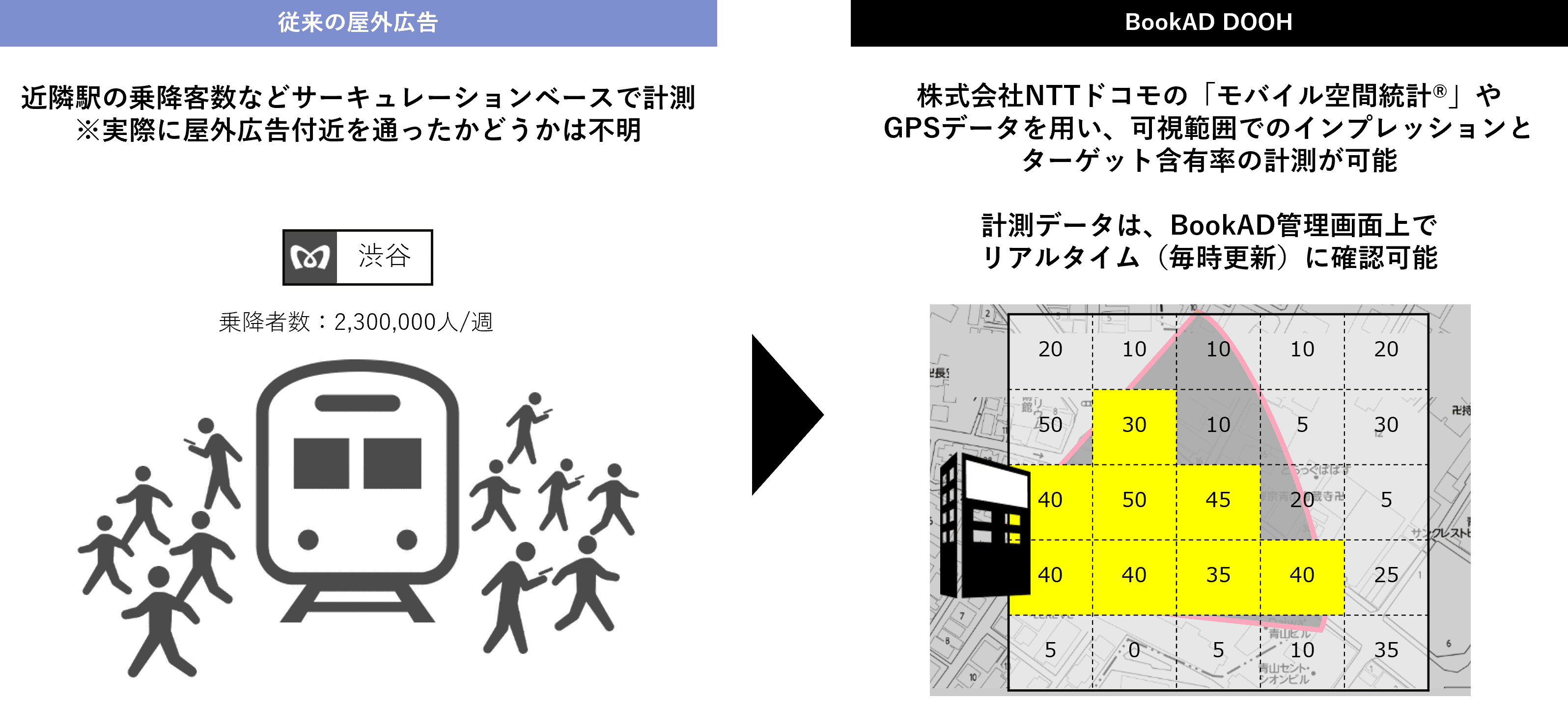 株式会社NTTドコモの「モバイル空間統計」を活用したユーザー数情報をディスプレイごとの可視領域に当てはめました。それにより、効果計測が難しかった屋外サイネージ広告において、インプレッション(推定到達人数)の計測を可能にしました。