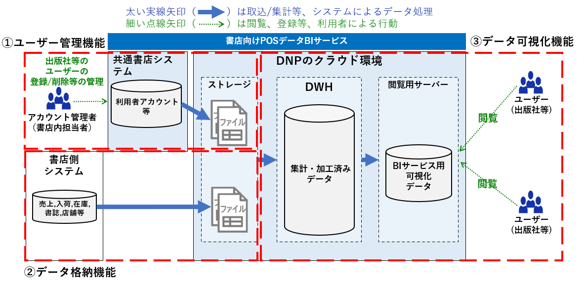 DNPが書店法人様からお預かりしたPOSデータ(書籍購買データ)等を集計・可視化し、出版社様等のユーザーに対してBI(ビジネスインテリジェンス)※サービスを展開するための環境を提供するサービスです。