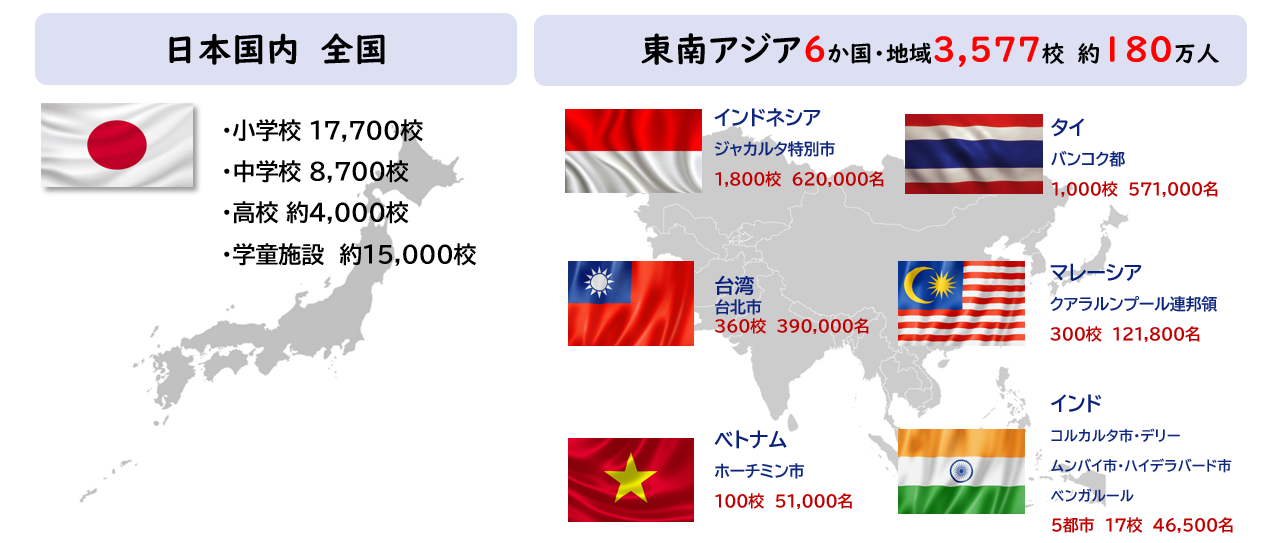 このサービスは主に子供を持つ「ママ」のブランド好感度を上げる事を想定した「啓発的企業ブランディング施策」で、国内のみならず東南アジア諸国までをそのサービス提供範囲に設定しています。 アジアの小学校の国内17,700校、東南アジア6カ国・地域(インドネシア・タイ・ベトナム・台湾・マレーシア・インド)約3,600校にてサンプリングや媒体配布・啓発授業の実施が可能で、学校を通じて子供たちの成長に貢献する事を通じてその保護者である「ママ」の企業ブランドに対する好感度を上げる事ができます。 東南アジア・日本地域における「中長期視点からのファンマーケティングの実施・育成」「ママ層のロイヤリティ向上」「CSR、SDGSの推進」を実現できるサービスになっています。