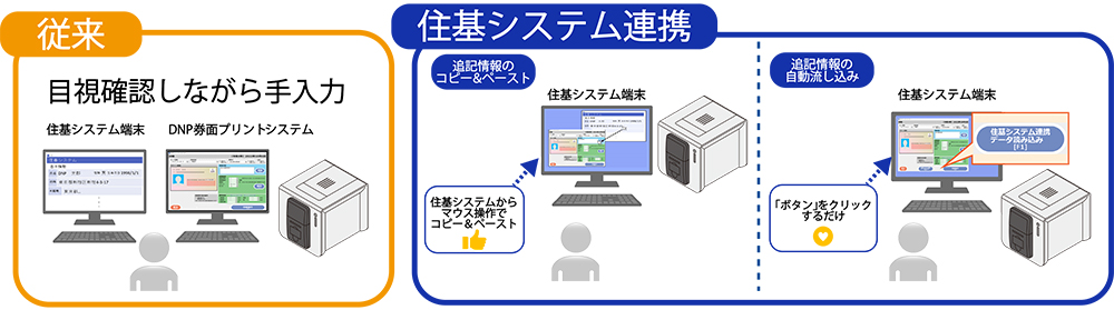 DNP券面プリントシステムと住民基本台帳システム(住基システム)を連携させることで、追記情報の手入力をなくせます。