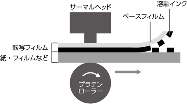 インクリボンは厚さ3~6ミクロンという極薄のポリエステルフィルムにカーボンや印刷用カラー顔料をワックス系材料と混ぜたインキを数ミクロンの厚さで均一に塗布して製造されます。このインクリボンに、サーマルヘッドから熱が伝えられると、その部分だけインキが溶けて紙やラベルなどに転写され、バーコードや文字などの画像が形成されます。サーマル方式とも呼ばれます。 |