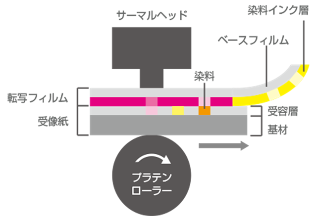 昇華型熱転写は専用のインクリボンと受像紙を使用します。インクリボンは極薄のポリエステルフィルムにイエロー・マゼンタ・シアンの3原色の昇華性染料が順に塗布されています。受像紙は紙や樹脂の基材上に転写された染料を定着させる特殊なコーティングをしてあります。インクリボンの各色染料をサーマルヘッドの発熱に応じて受像紙に転写し、高精細な画像を形成します。