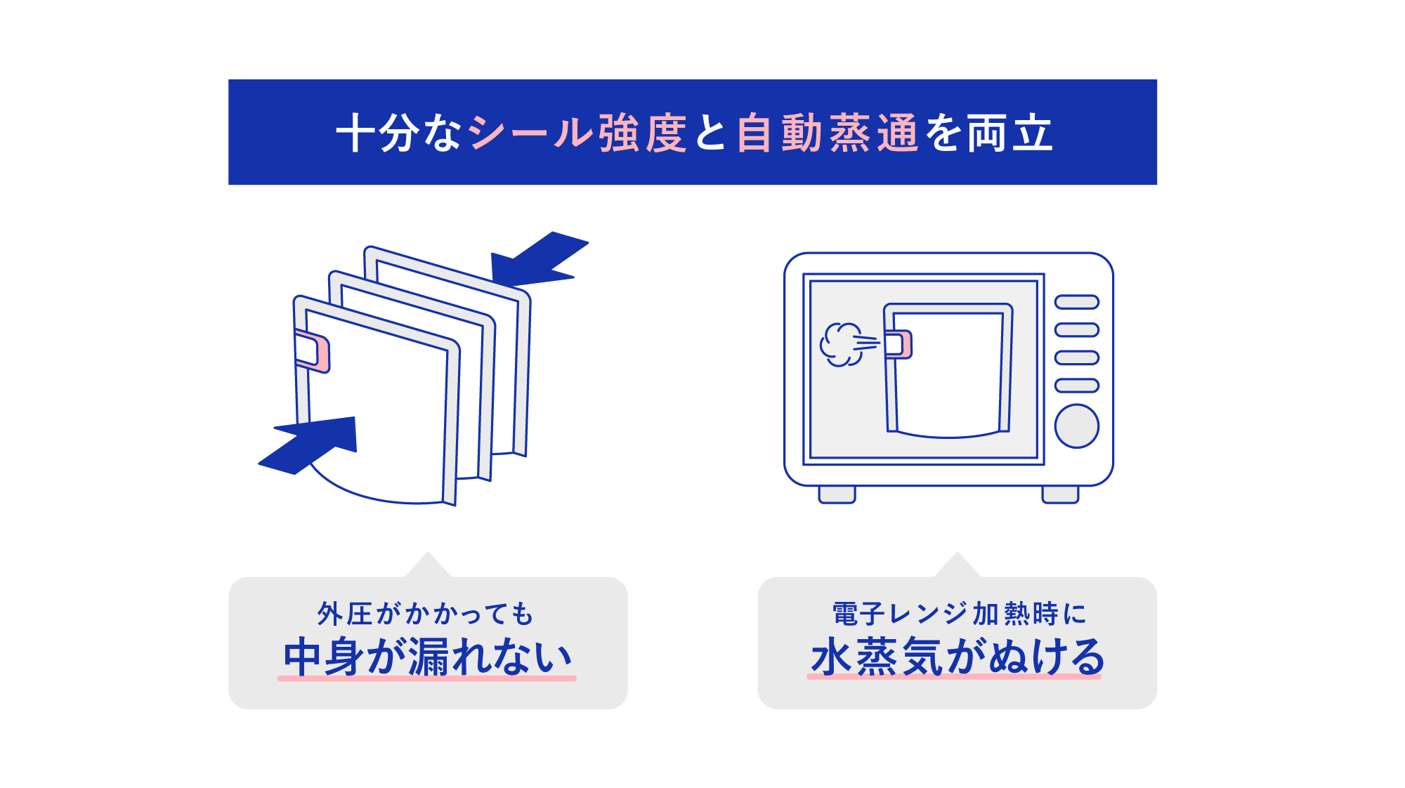 流通時に求められるシール強度と、電子レンジ調理時の自動蒸通機能を両立