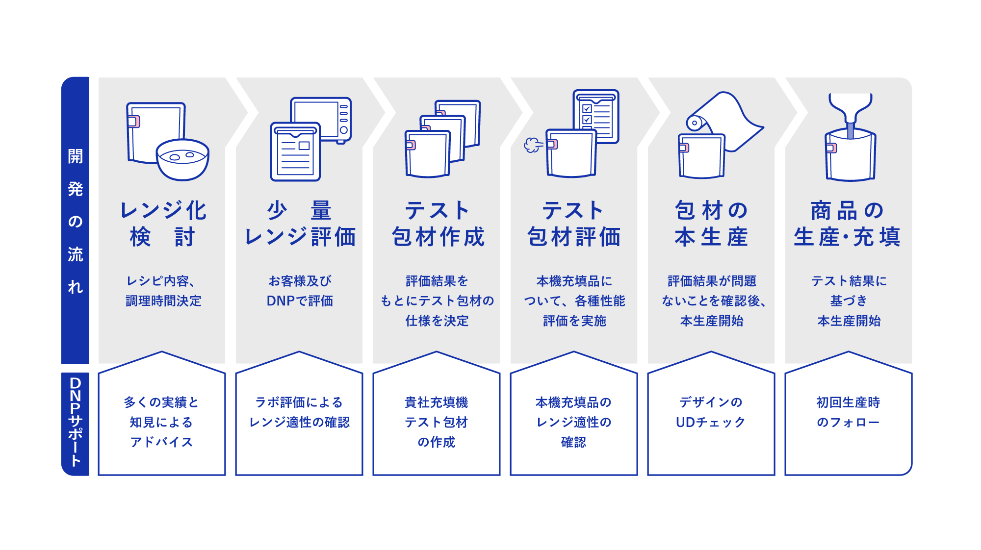 設備投資などによる市場参入時のハードルを下げ、さまざまな殺菌方法や流通温度帯に対応したラインアップにより、電子レンジ商品開発の立ち上げをサポートします。