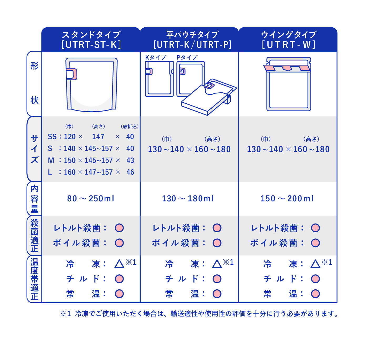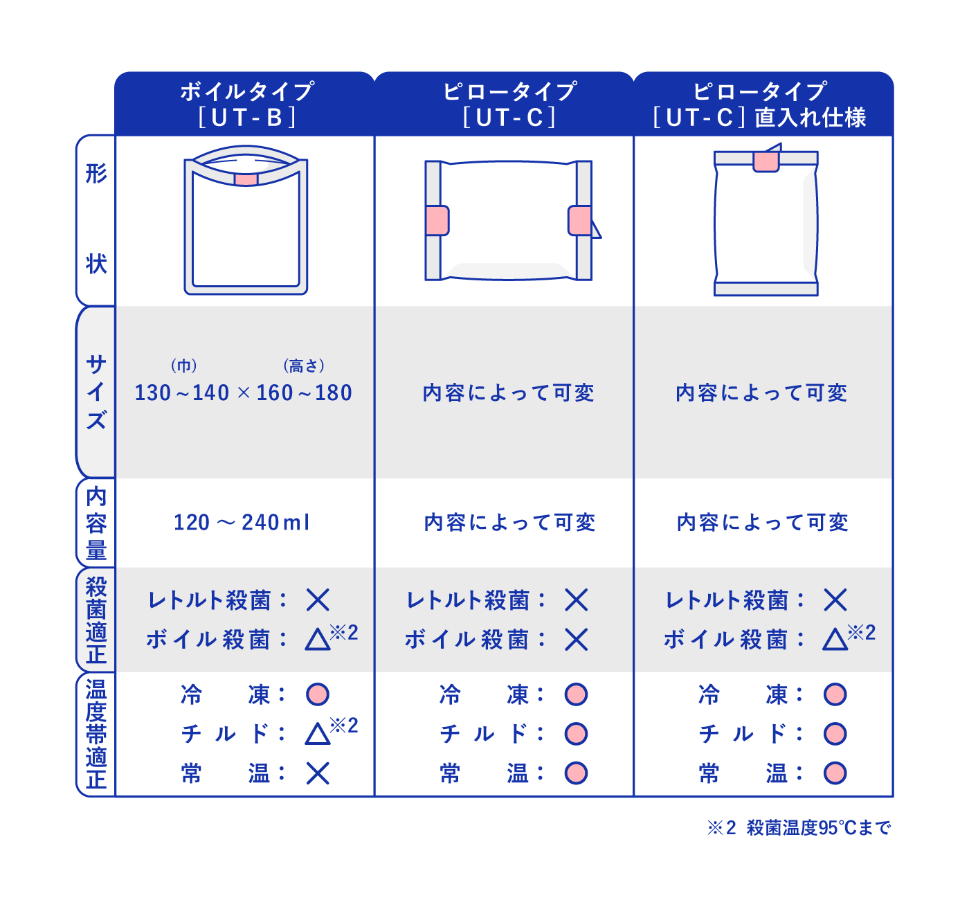 レトルト殺菌・ボイル殺菌の製造や常温・チルド・冷凍等のさまざまな流通条件に対応したパッケージのラインアップがあります。