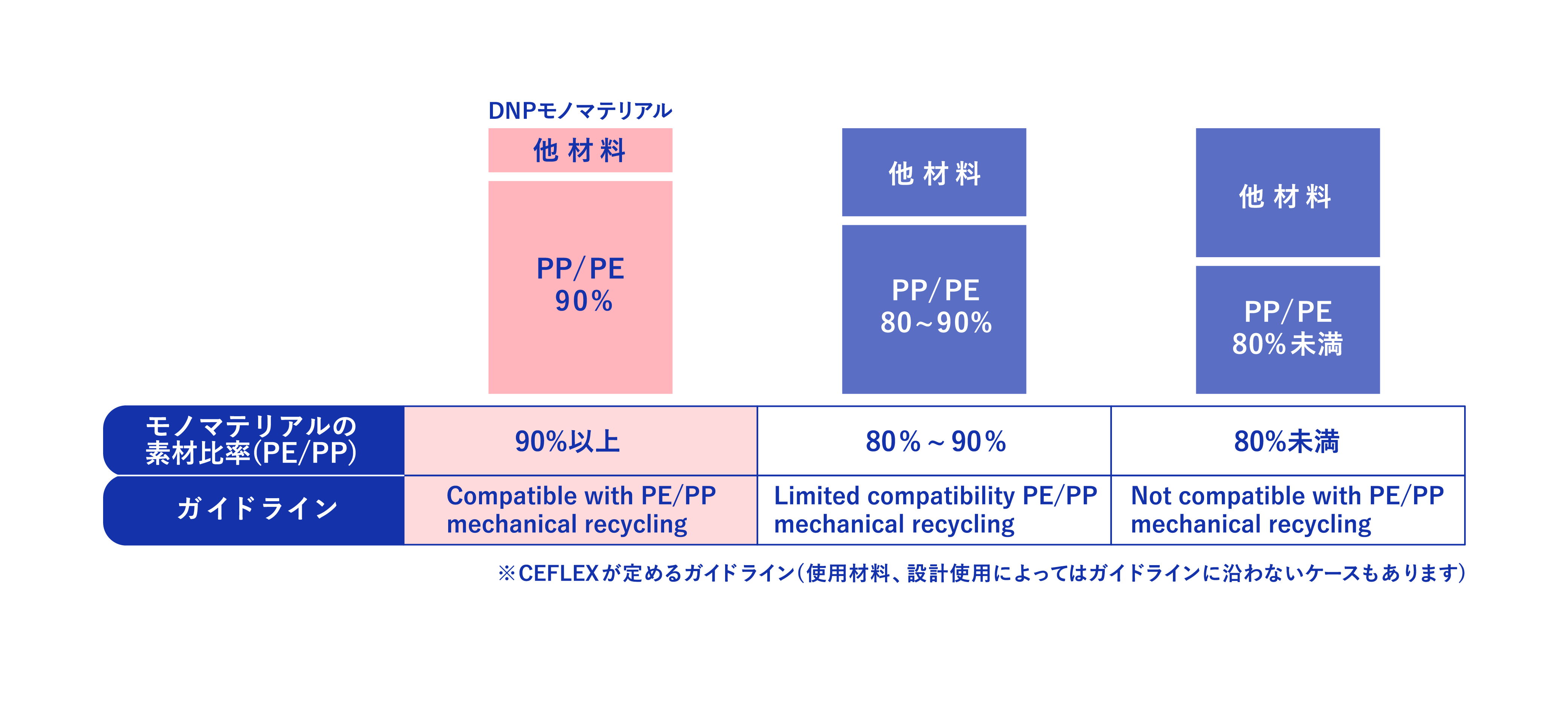 欧州と米国におけるプラスチックリサイクルの基準を満たしたモノマテリアル包材を提供します。例えば、欧州では「CEFLEX」という欧州の軟包装業界で循環型経済を推進するコンソーシアムがガイドラインを定めています。DNPは同コンソーシアムに加入しており、最新のガイドラインに準拠した仕様設計、提案を進めています。