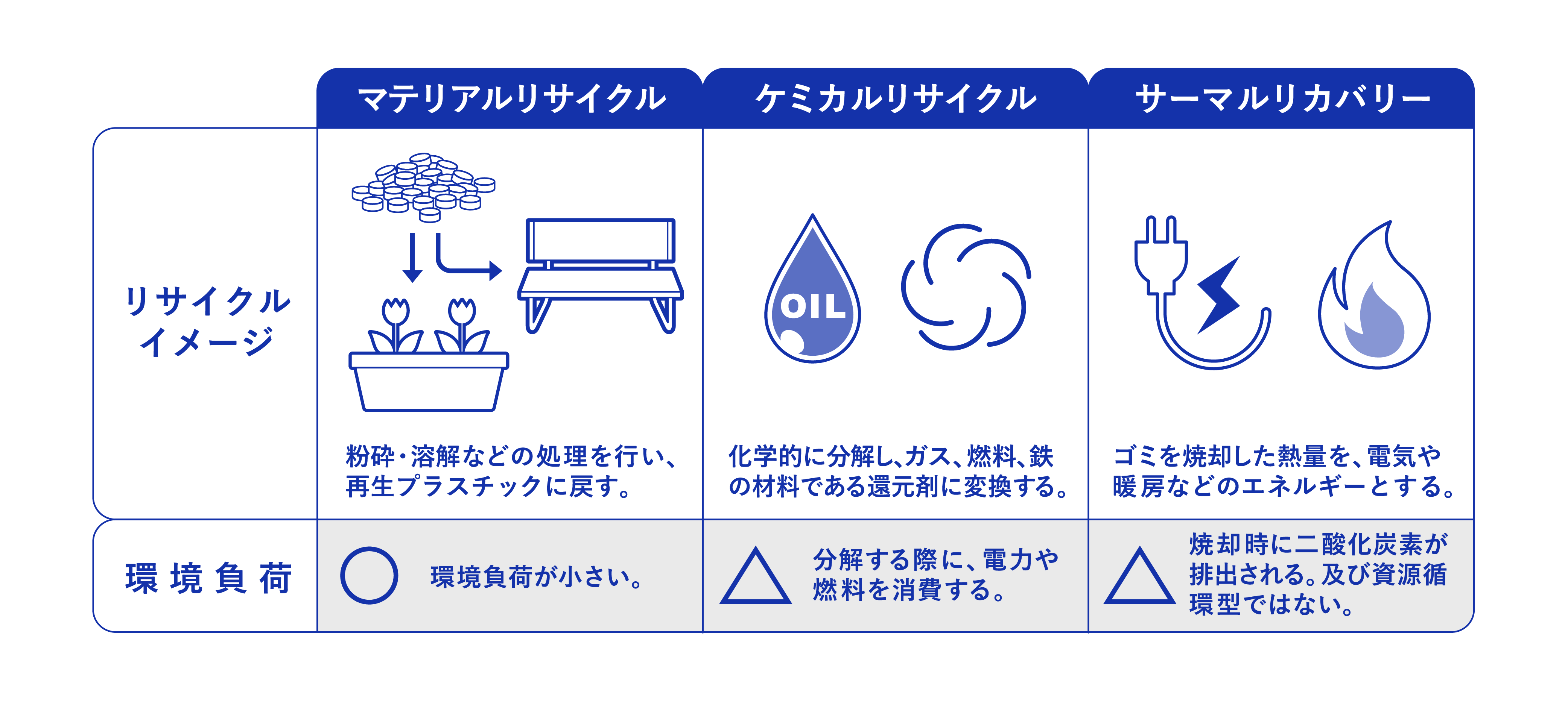 現在、廃プラスチックの有効利用方法としてマテリアルリサイクル、ケミカルリサイクル、サーマルリカバリーの3つが世界では主流となっています。焼却技術や設備が普及している日本では、サーマルリカバリーの割合が多く占められています。一方で、海外では焼却技術や設備が日本よりも普及されておらず、マテリアルリサイクルやケミカルリサイクルが目立ちます。