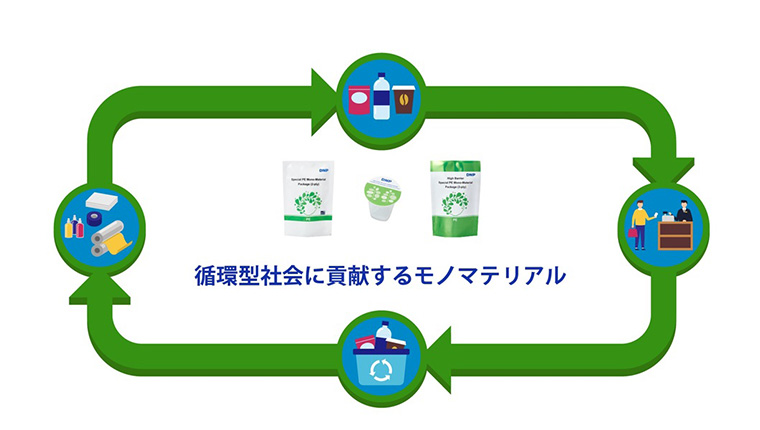 DNPはこれまで培ってきた独自のコンバーティング技術や製膜技術、蒸着技術などを活かしてパッケージに必要な機能を付与することで、ポリエチレン(PE)仕様またはポリプロピレン(PP)仕様のモノマテリアル包材を実現しました。