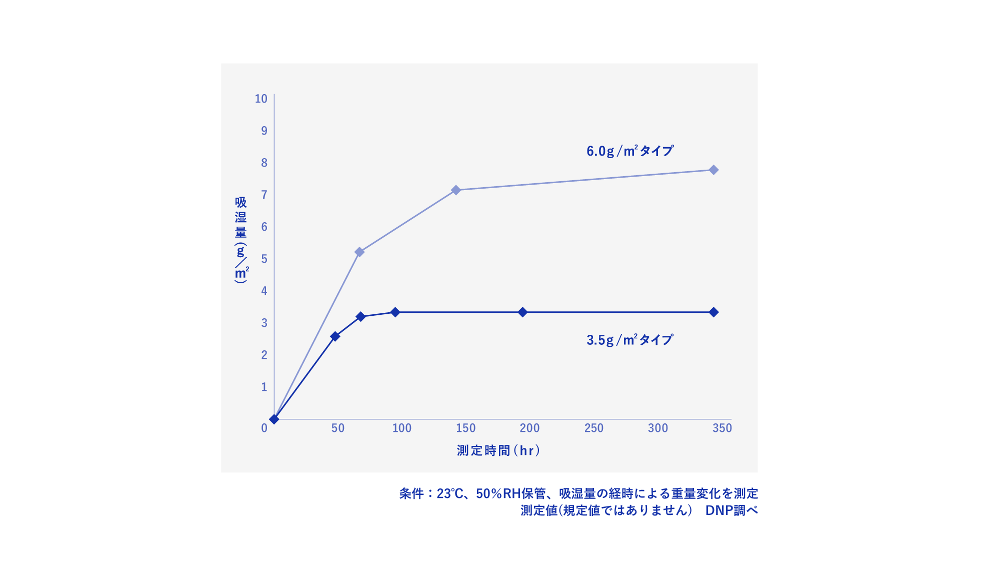 - 現在、吸湿量で3.5g/m2タイプを製品ラインアップしており、6.0g/m2タイプをご希望の方はお問合わせください。