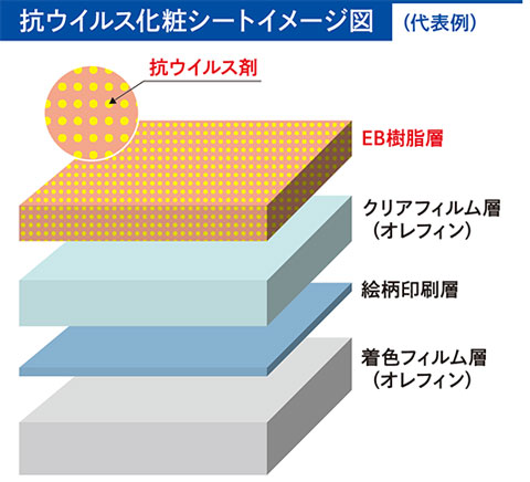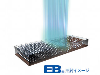焼却しても有害なガスをほとんど発生しない環境配慮材料であるオレフィンを使用し、EB(電子線:Electron Beam)の照射によリさまざまな機能を持たせた化粧シートです。