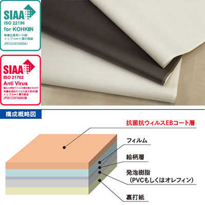 抗ウイルスEBコーティング壁紙PVC不燃仕様と、抗菌EBコーティング壁紙オレフィン準不燃仕様のそれぞれで、SIAA認証を取得しました。