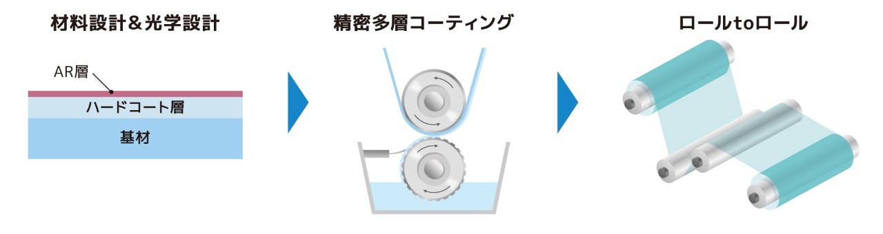 ARフィルムの製造方法には、「真空蒸着法」や「スパッタ・CVD法」、「ウェットコーティング法」などがあります。DNPでは、比較的生産性の高いウェットコーティング法を採用しておりますが、硬度も兼ね備えた反射率0.1%の高機能な製品の生産を可能にしています。