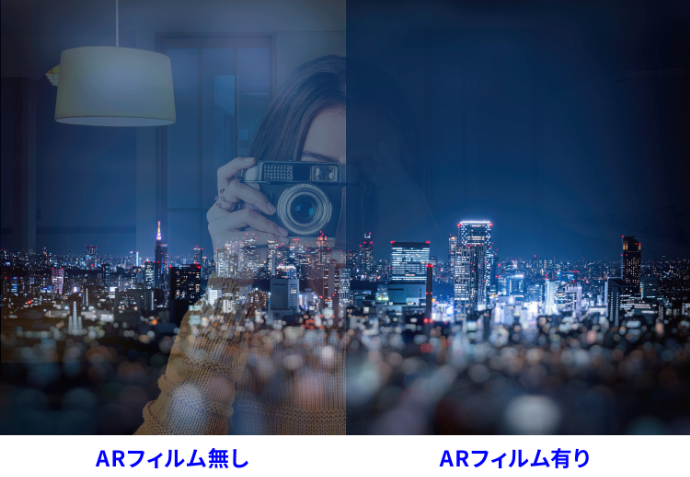 ARフィルムを採用することにより、ディスプレイ画面に外から光が当たっても、その影響を軽減して画面がきれいに見えるようになります。