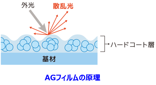 似たような効果を狙ったフィルムとして、AGフィルム(AG:Anti-Glare)があります。AGフィルムはベースとなるフィルム基材の表面に粒子を配置させたハードコート層を塗布することで表面凹凸を形成させ、入射光を凹凸面で乱反射させて外光の映り込みを軽減させるもので、光の干渉を利用するARフィルムとは仕組みが異なります。