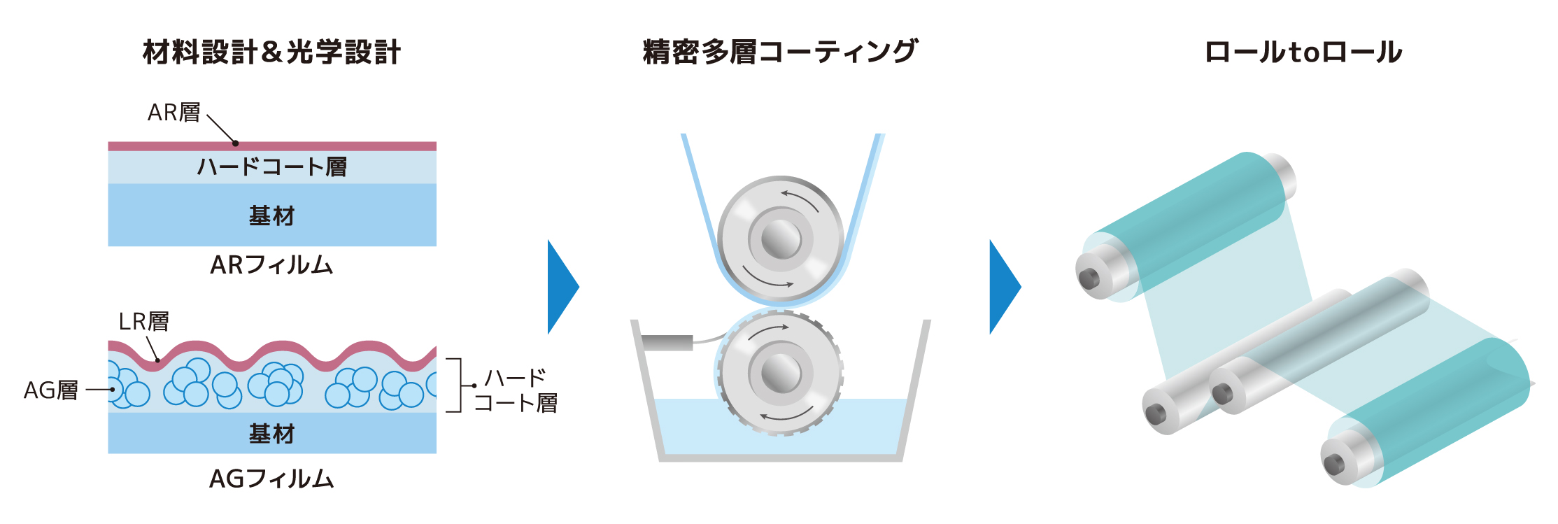 薄膜コーティングとは、ベースとなるフィルム基材の上に薄膜層を作り、さまざまな機能をフィルムに付与する技術です。薄膜を形成することで、フィルムの表面を保護したり、特定の性質を付加することができ、DNPではAG(Anti-Glare)やAR(Anti-Reflection)といった反射防止をはじめとした、さまざまな機能をフィルムに付与することに応用しています。