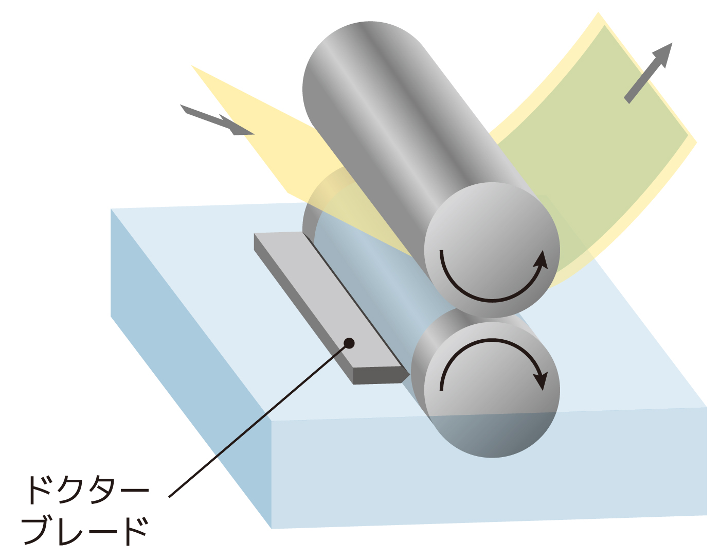 グラビアロール(凹版彫刻されたロール)に塗液を付着させ、ドクターブレードで余分な塗液をかき落とすことで塗布量を調整して塗布する方式で、比較的粘度の低い塗液を使用する際に向いています。リバース方式と同様、搬送されるフィルムに対して逆方向に回転させるため、回転速度比の調整が膜厚や品質に大きく影響します。