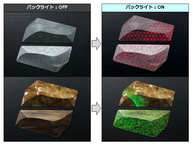 スイッチパネル、ドアガーニッシュ、インストルメントパネルなどの内装パーツに、背面から光を照射することで、柄や色合いを変化させることができる加飾フィルムです。