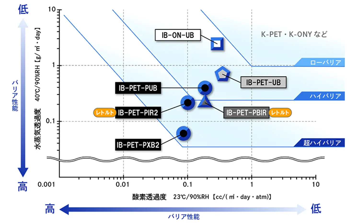 また、水蒸気と酸素のバリア性能をIB-FILMのグレードで比較した結果は以下のとおりです。