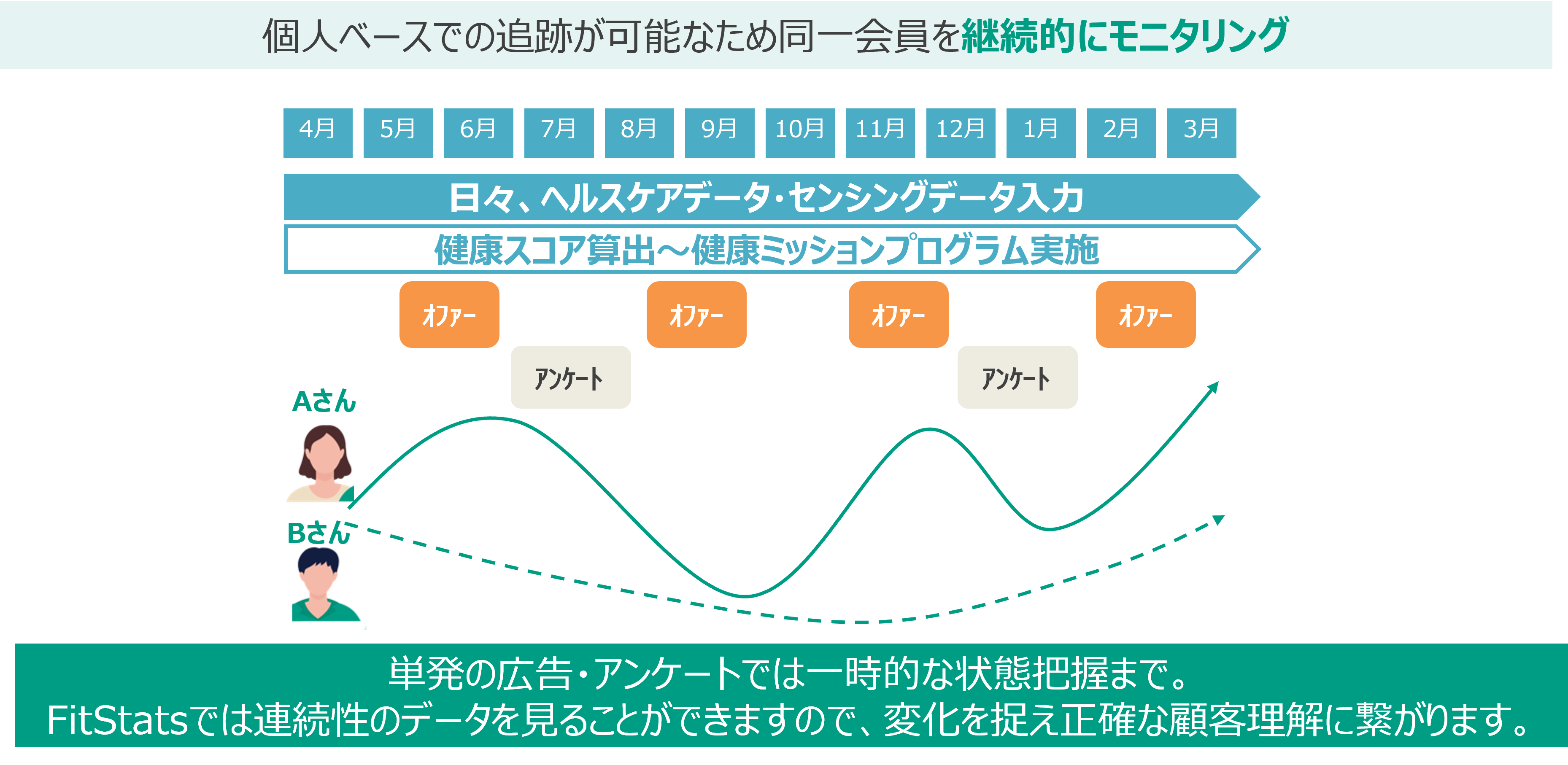 - 単発的な広告・調査とは異なり、生活習慣の変化など長期的なユーザーのモニタリングができる