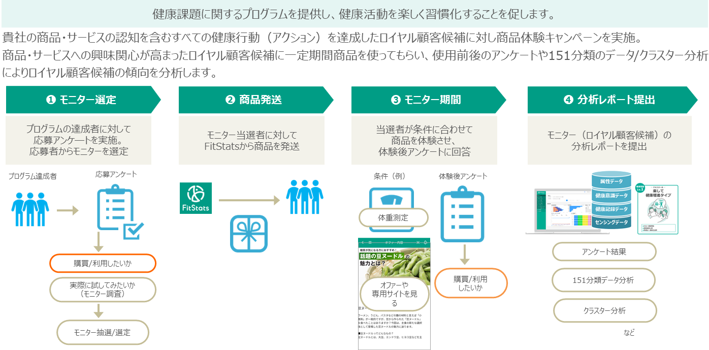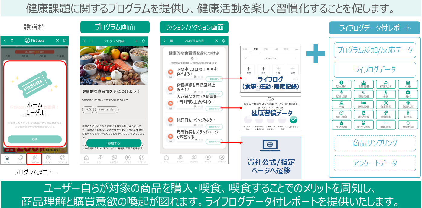 - 健康意向の高いFitStatsユーザーに商品をサンプリング、ユーザーの健康行動変容が把握できる