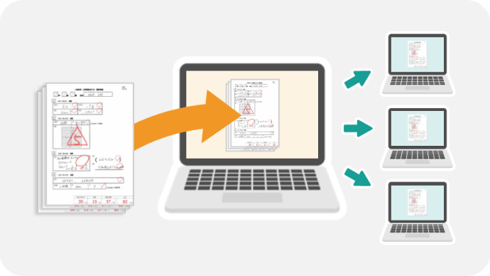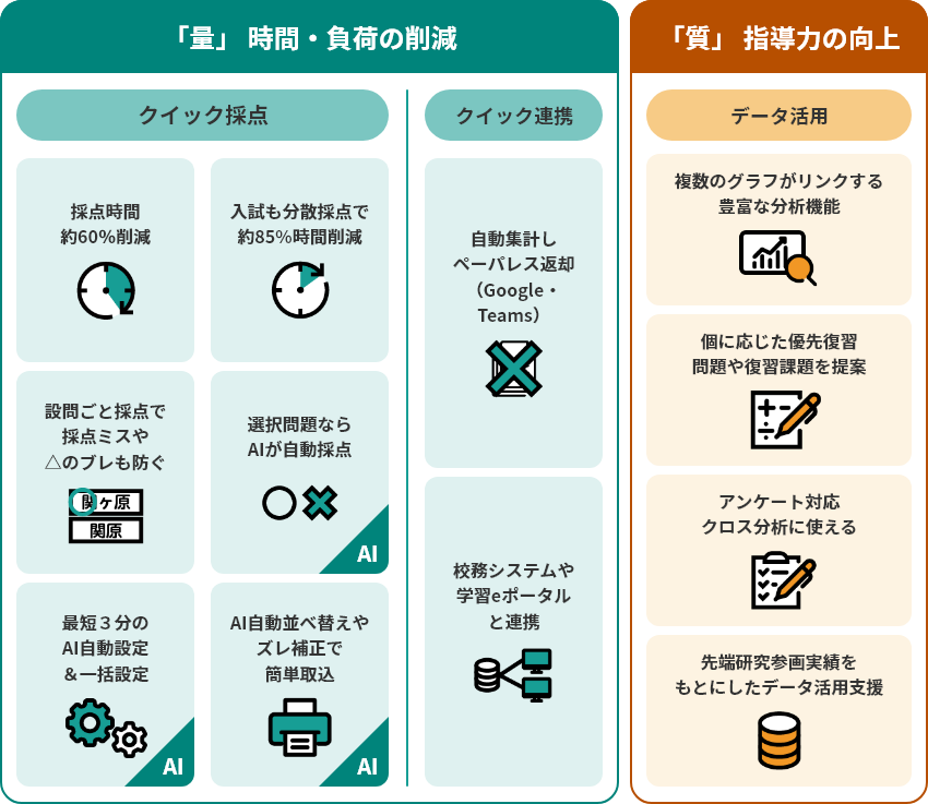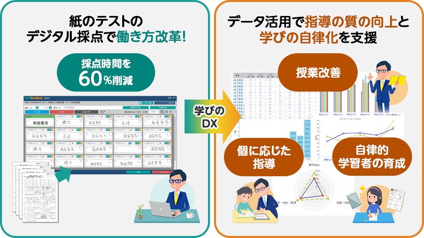紙のテストのデジタル採点で、先生の働き方改革を実現。蓄積されたデータの可視化・分析により、採点業務の効率化だけではなく、データにもとづく指導の両面で教員の働き方改革と学びのDXを支援します。