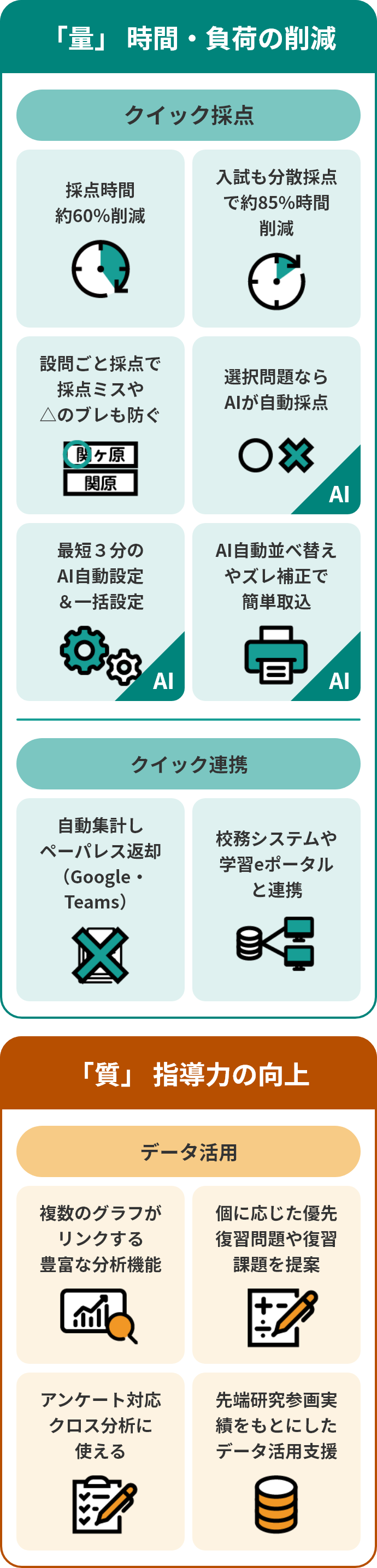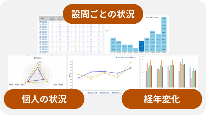 紙のテストをデジタル採点&データ分析。 採点と同時に自動集計された学習データから、指導が必要な生徒を見つけたり、指導すべき学習課題を分析することができます。