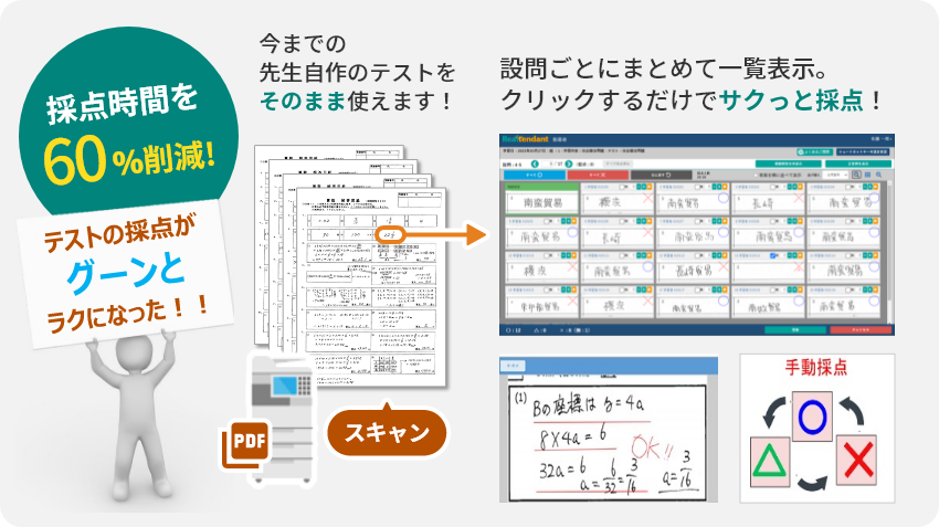 - 今まで残業や土日を使い自宅に持ち帰っていたが、テスト日に校内で採点を完結することができ感動した。