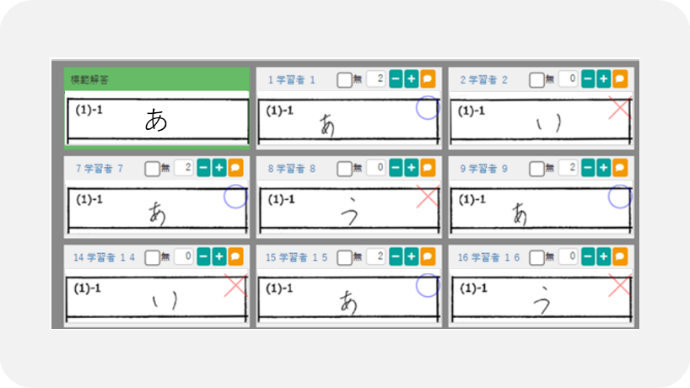 先生自作のテストの解答用紙をスキャンして取り込むことで、同じ設問の解答を一覧で表示。クリックするだけで一括で〇を付けたり、△を並べて部分点を比較したり、従来より約60%時間を削減してデジタル採点することができます。