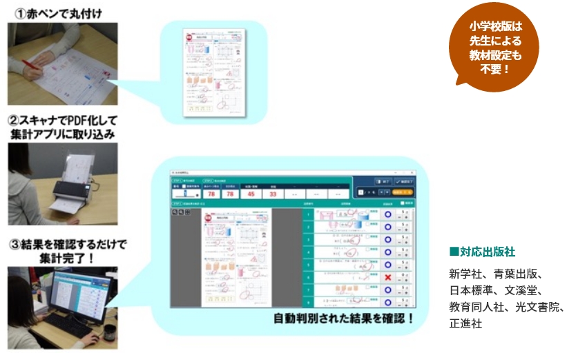 ○×を再鑑するだけなので、ICT支援員やスクールサポーターとの連携により、さらなる効率化も可能です。