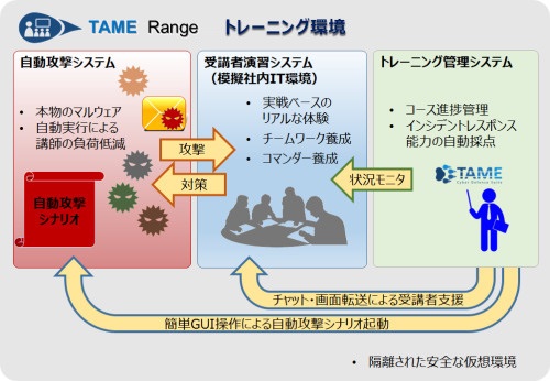 TAME Rangeは、サイバー攻撃の脅威に対抗できるレベルへセキュリティ技術者の能力向上を支援する訓練システムです。