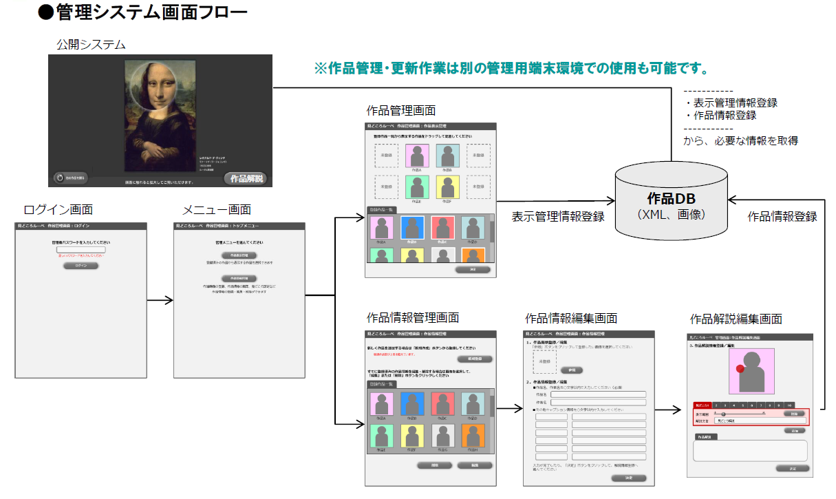 管理システムにより、作品画像やテキスト情報、また、見どころとなるエリア指定などの登録、入れ替え、修正、更新が可能です。