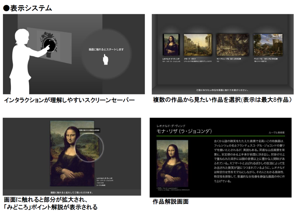 「みどころルーペ」は、高精細タッチパネルディスプレイを用い、作品の細部、技巧、質感などをデジタルルーペで拡大し、緻密な観察ができる汎用的な美術鑑賞システムです。美術館や博物館、図書館の作品や資料の鑑賞補助ツール、ワークショップツールとして、作品への興味喚起や理解を促進します。