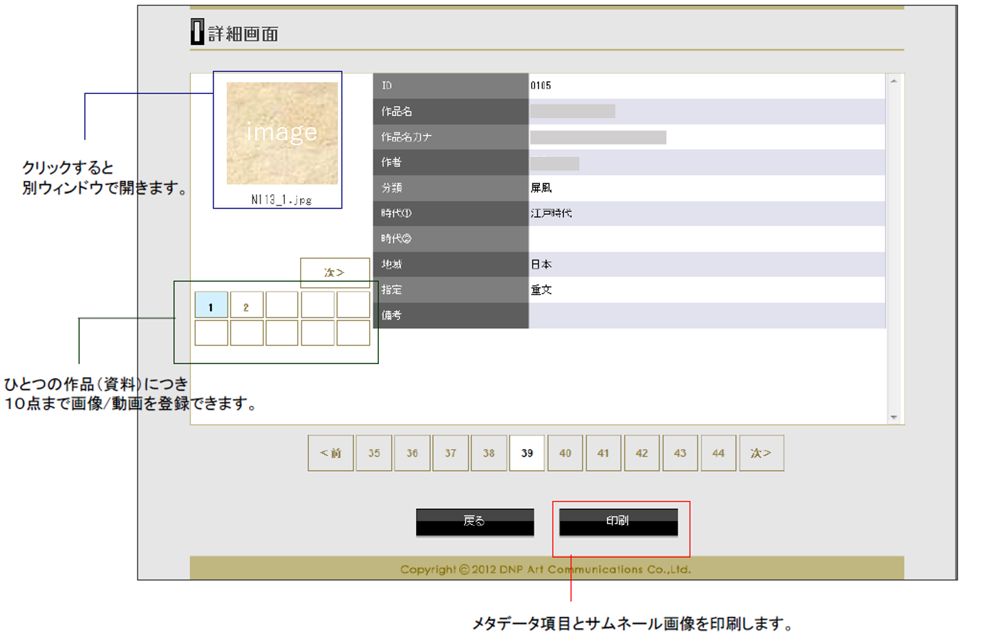 1つの資料に対して最大10点のデジタルコンテンツ(画像、動画)が登録可能です。(登録可能ファイル:JPEG、TIFF、EPS、PDF、mpeg、avi、mov、wmv)