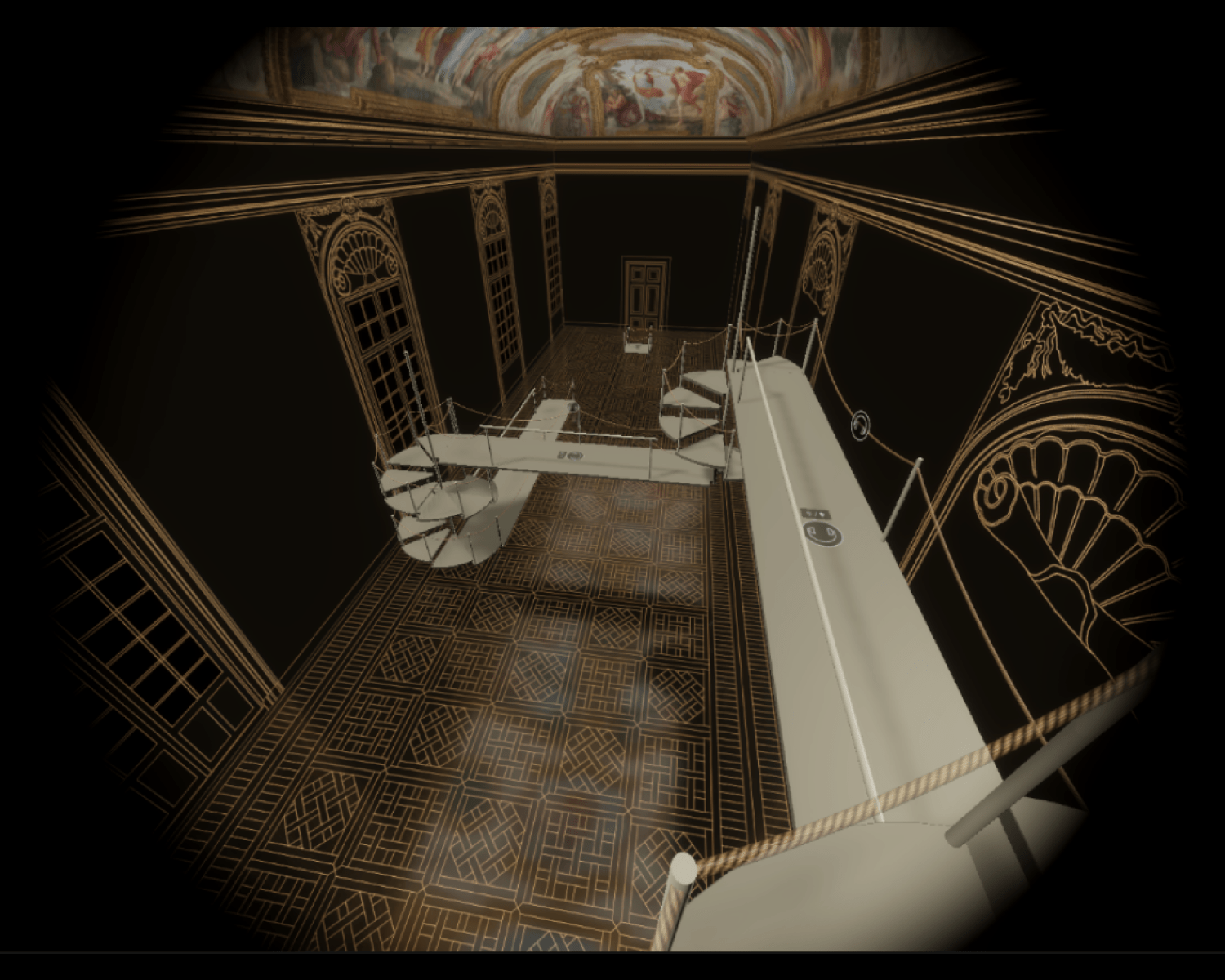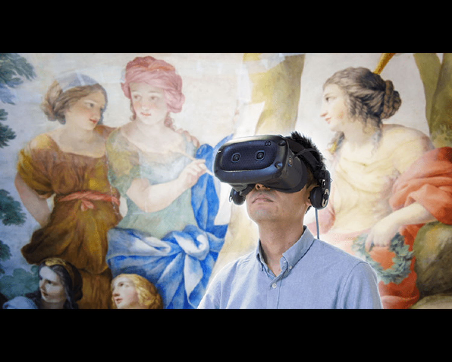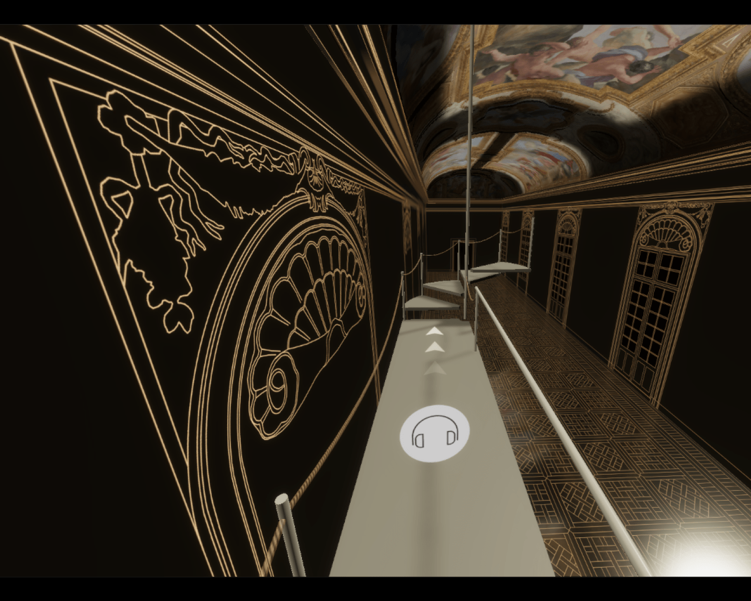 本展示の中で、「マザラン・ギャラリー」のVR(仮想現実)空間内に入り込み360度見回すことで、実際に訪れたような体験に「みどころウォーク」を導入しました。解説を聞きながらVR空間を移動し、17世紀より受け継がれる天井画を描いた画家の視点に近づいて、見どころやその歴史をたどります。
