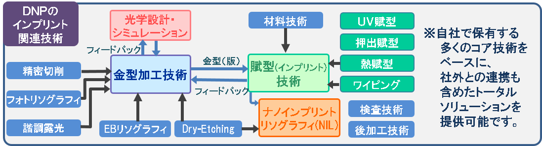 ナノインプリント(賦型)技術と、それを支える形状設計(光学設計)、金型加工、材料技術、評価技術をベースに、設計~原理検証から少量試作検証~生産までを、お客様のニーズに合わせてトータルでサポートするサービスです。